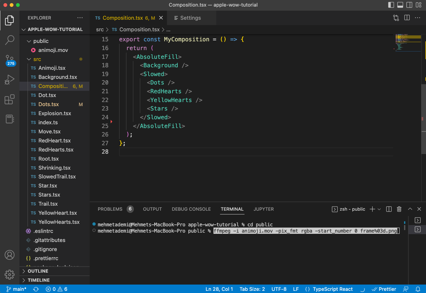 importReact from "react";import {AbsoluteFill } from "remotion";import {Animoji } from "./Animoji";import {Background } from "./Background";import {Dots } from "./Dots";import {RedHearts } from "./RedHearts";import {Slowed } from "./SlowedTrail";import {Stars } from "./Stars";import {YellowHearts } from "./YellowHearts";export constMyComposition = () => {return (<AbsoluteFill ><Background /><Slowed ><Dots /><RedHearts /><YellowHearts /><Stars /></Slowed ><Animoji /></AbsoluteFill >);};
